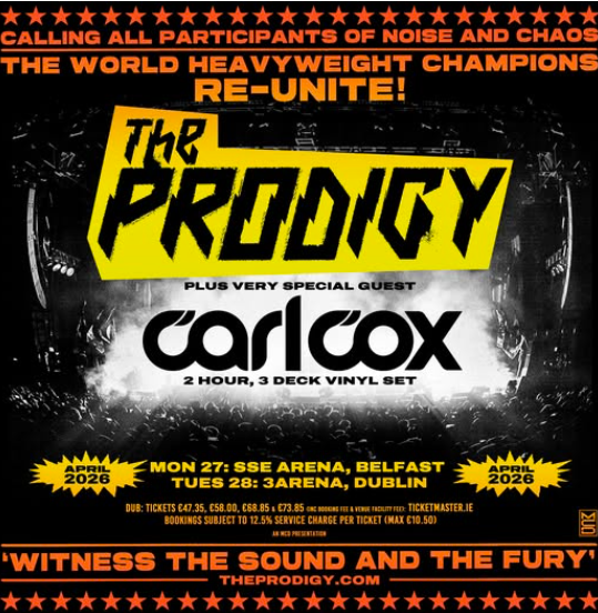 Electronic music pioneers The Prodigy bring their legendary live show to Dublin as part of their latest tour, continuing their status as one of the most influential and high energy acts in electronic music history. Emerging from the UK rave scene in the early 1990s, the group helped redefine electronic music by fusing breakbeat, techno, punk attitude, and industrial sounds into a fiercely distinctive style.